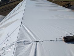 今回の被覆素材は「白白コート5」。屋根面を張る際は、下が見えないので普通に歩くことが出来ず、